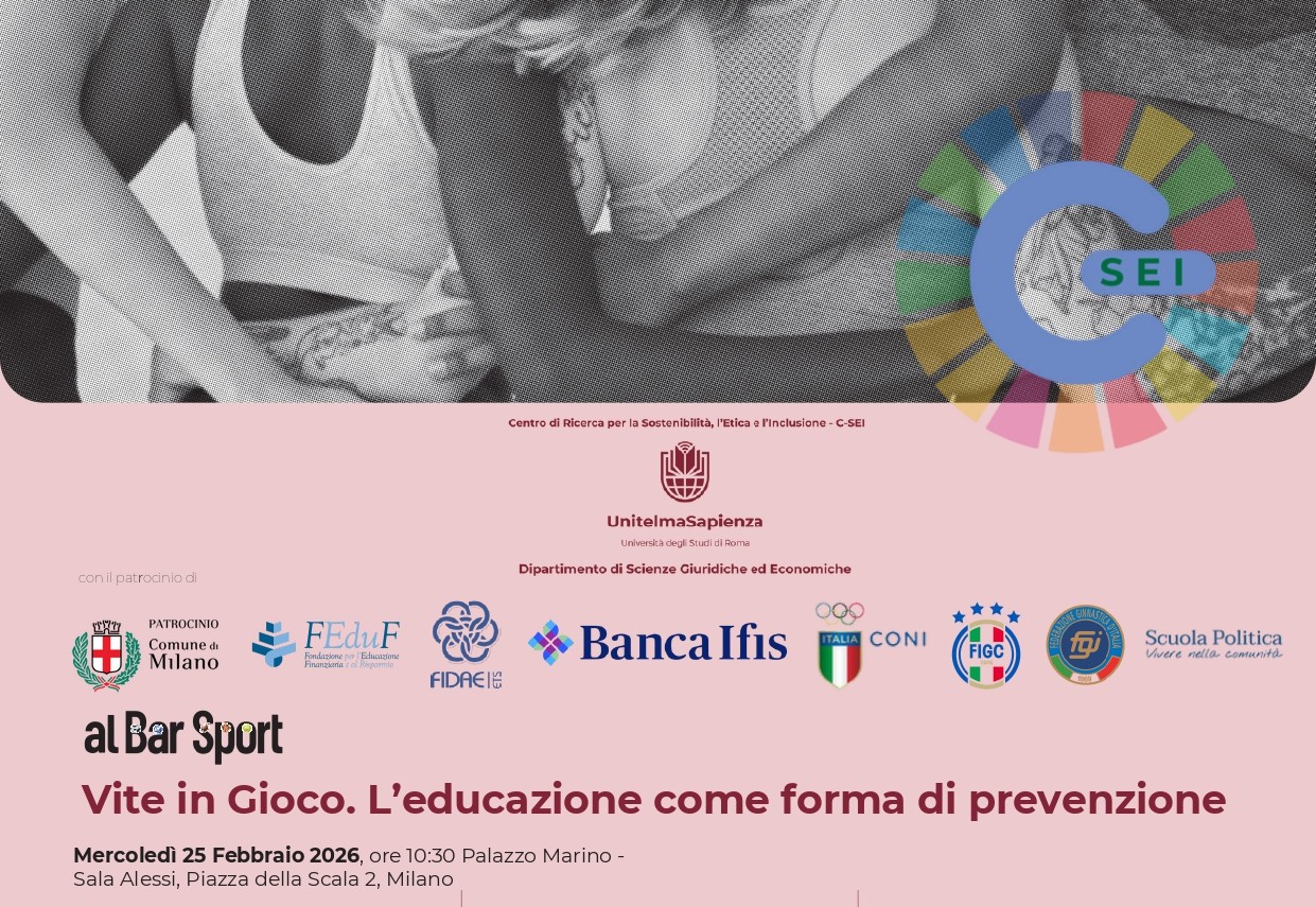 L’evento si svolge nell’ambito del progetto Al Bar Sport, promosso dal Centro di Ricerca per la Sostenibilità, l’Etica e l’Inclusione (CSEI) dell’Università degli Studi di Roma UnitelmaSapienza, in collaborazione con FEduF – Fondazione per l’Educazione Finanziaria e al Risparmio, la Scuola Politica “Vivere nella Comunità” e Banca Ifis.