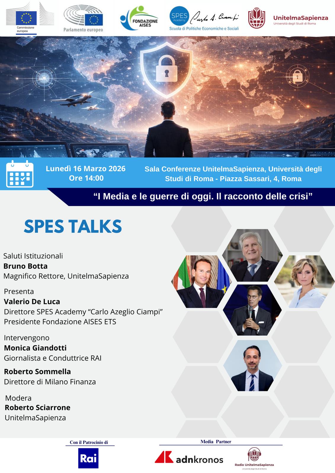 I Media e le guerre di oggi: il racconto delle crisi. Si svolgerà lunedì 16 marzo alle ore 14:00, presso la Sala Conferenze di UnitelmaSapienza e in streaming sul canale YouTube di Ateneo, il primo incontro del ciclo di seminari “Spes Talks” promosso dalla Fondazione AISES-ETS, dalla SPES Academy “Carlo Azeglio Ciampi” e dall’Università degli Studi di Roma UnitelmaSapienza.