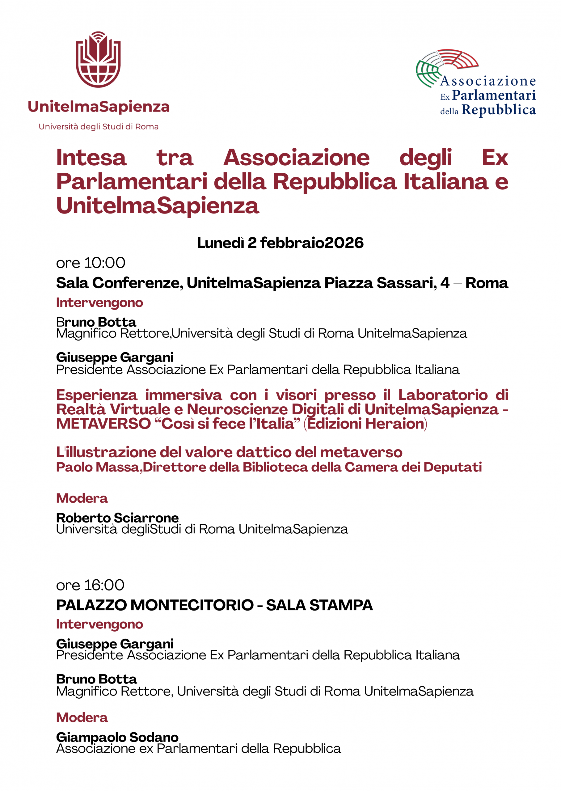 Lunedì 2 febbraio 2026, presso la Sala Conferenze di UnitelmaSapienza (Piazza Sassari 4, Roma), si terrà la presentazione ufficiale dell’intesa tra l’Associazione degli Ex Parlamentari della Repubblica Italiana e l’Università degli Studi di Roma UnitelmaSapienza, finalizzata a promuovere iniziative congiunte nei campi della formazione, della ricerca e della valorizzazione della memoria storica e istituzionale del Paese.