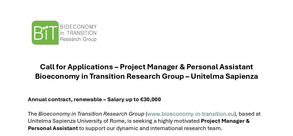 The Bioeconomy in Transition (BiT) research group is pleased to announce the opening of a position for a Project Manager & Personal Assistant....